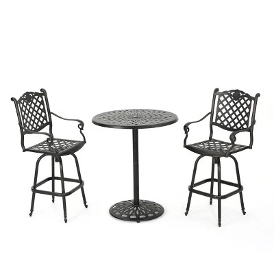 This Christopher Knight Home Arlana 3pc Cast Aluminum Bar Set is the ideal place to enjoy a cocktail on a warm summer evening. Both the table and chairs are made of durable cast aluminum. These pieces are strong enough to hold up to the elements, yet light enough to be moved around with ease. Create an intimate dining area in your backyard with this Christopher Knight Home Arlana 3pc Cast Aluminum Bar Set. A purchase you will enjoy for years to come.
