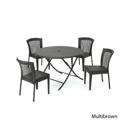 The beautiful blend of iron and wicker comes to life with this Christopher Knight Home Rai 5pc Wicker Dining Set. Complete with 4 wicker dining chairs, you can enjoy eating in your backyard whenever you want. The circular table ensures that there is enough space for both food and people, meaning no one leaves the table hungry. Plus the table is foldable and the chairs are stackable for easy storage when not in use. Create an outdoor dining space with this Christopher Knight Home Rai 5pc Wicker Dining Set.